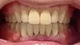 入れ歯の土台に使用する前歯の被せ物については、金属の表面にセラミックを焼き付けた「メタルボンド」を選びました。審美性と強度を兼ね備えた入れ歯に仕上がっています。