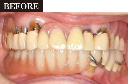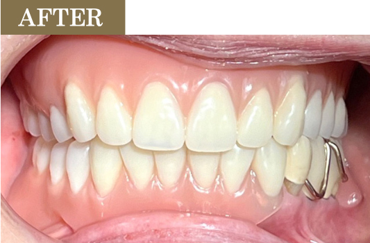通常、ゲルバーメソッドは総入れ歯に用いられますが、今回は下の部分入れ歯にも取り入れました。この理論を用いて作製することで、顎関節に負担がかからない、安定して噛める入れ歯に仕上げています。