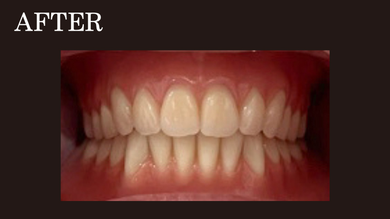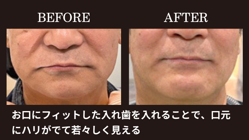 入れ歯の装着前と後のお写真を比較すると、口元に張りが出て若々しい印象になったことがお分かりいただけるでしょう。患者さまからは「違和感なく噛める」「食事が楽しくなった」と好評です。